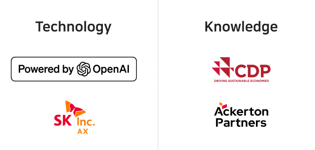 각 분야의 전문 컨설턴트와 SK그룹의 AI 기술 및 DT(Digital Transformation) 실적을 바탕으로, SHE/ESG 전략 수립, 공시·평가 대응,